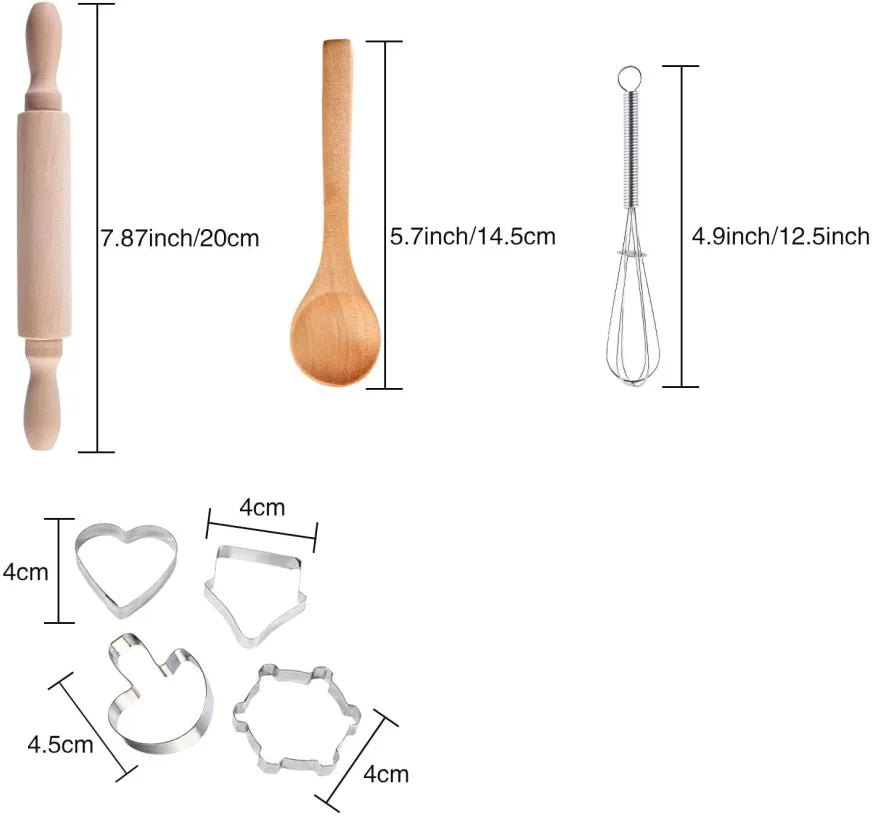 Clothes length 51CM* width 40CM, gloves length 17CM* width 12.5CM, rolling pin length 20CM, spoon length 14.5CM, hat diameter 18CM, egg beater 13CM, small cloth 11*11CM, 4 paste molds about 4 cm in diameter
